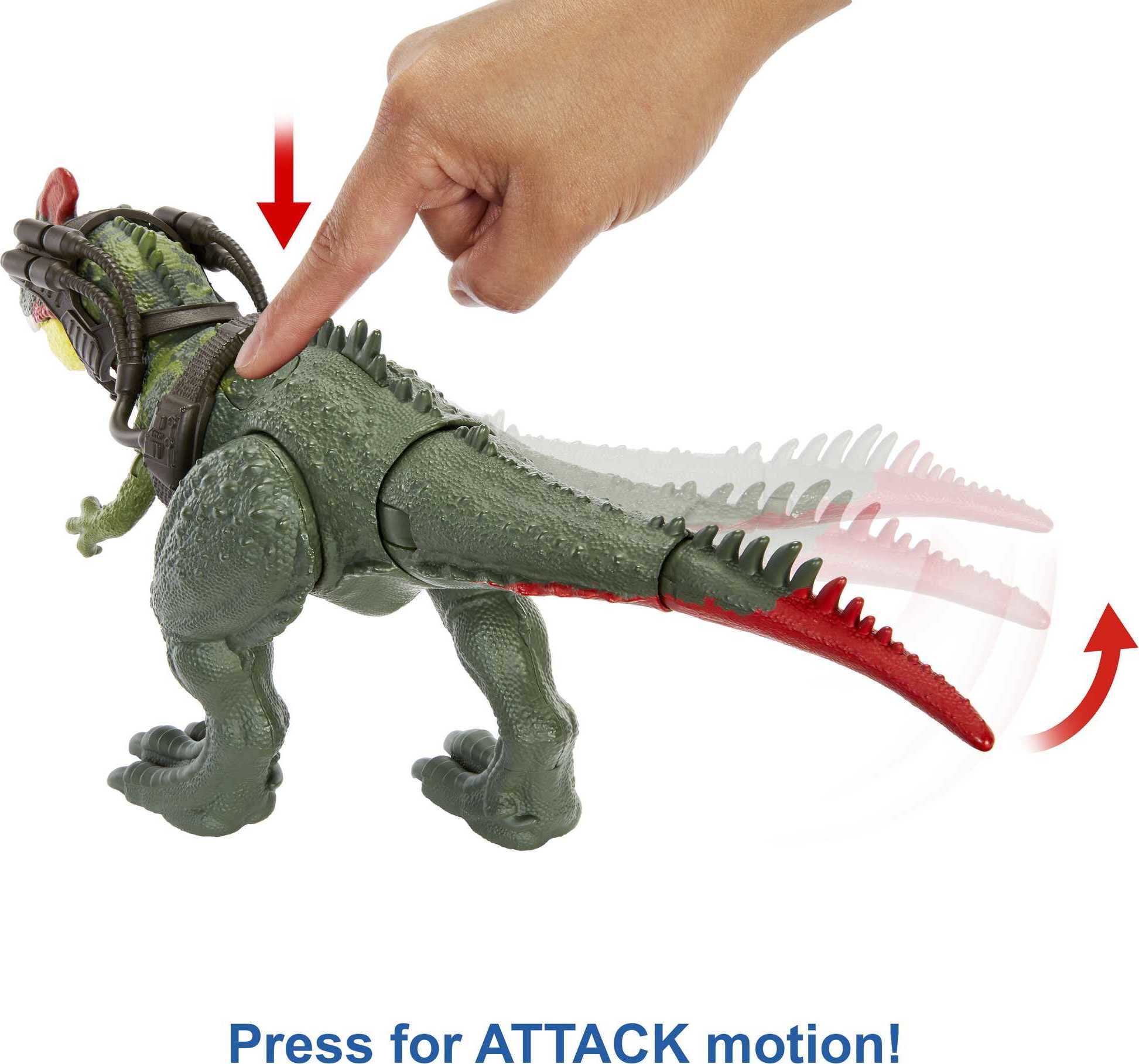 - Press one button for dramatic chomp attack and the other to activate the side-to-side head and tail motion. The attack actions work with or without tracking gear!